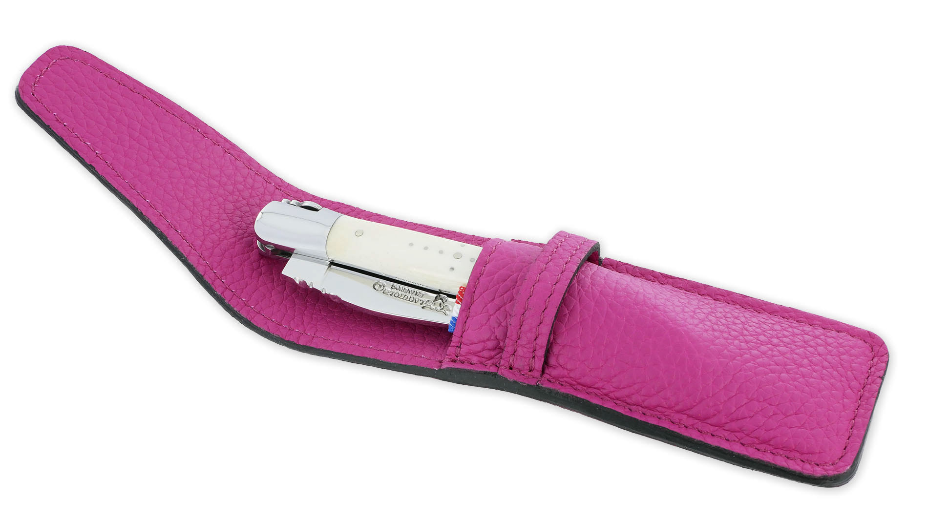Laguiole Fushia Rose Luxury Leather Case mit Korn – elegantes Accessoire mit französischer Flagge