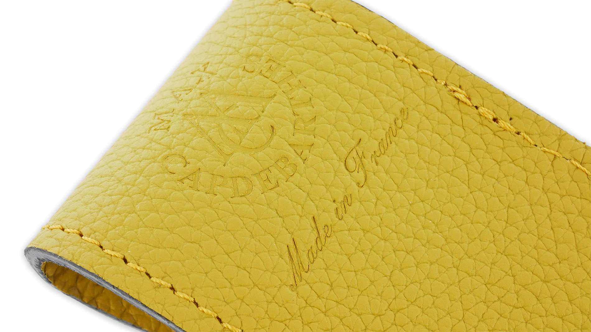 Verleihen Sie Ihrem Messer eleganten und leuchtenden Schutz mit dieser gelben, luxuriösen Lederscheide mit Maserung. Entworfen für Laguiole-Messer und Faltmesser von 10 bis 12 cm, vereint es perfekt Stil, Sicherheit und Praktikabilität. Außerdem passt es problemlos in eine Tasche für den täglichen Gebrauch.