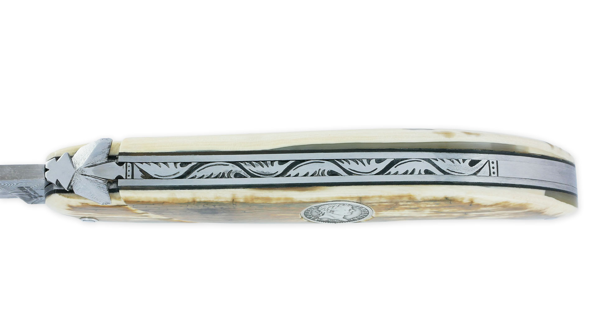 🟢 Folding hunting knife in bluish mammoth crust – Unique piece with Napoleon I laurel head half-franc in silver (1808)