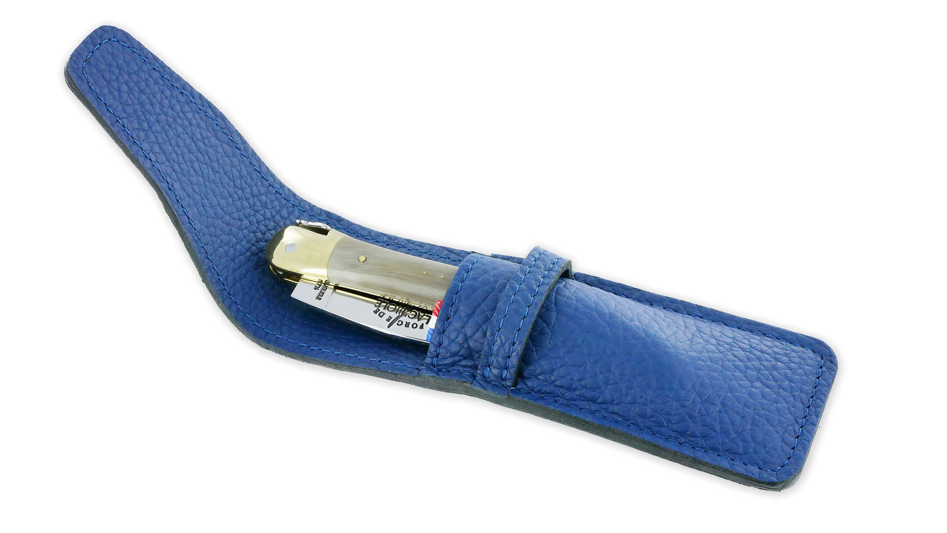 Give your knife elegant and timeless protection with this luxury navy blue grained leather case. Designed for Laguiole knives as well as folding knives from 9 to 12 cm, it perfectly combines style, security, and practicality. Moreover, thanks to its compact and functional design, it easily slips into a bag for everyday use.