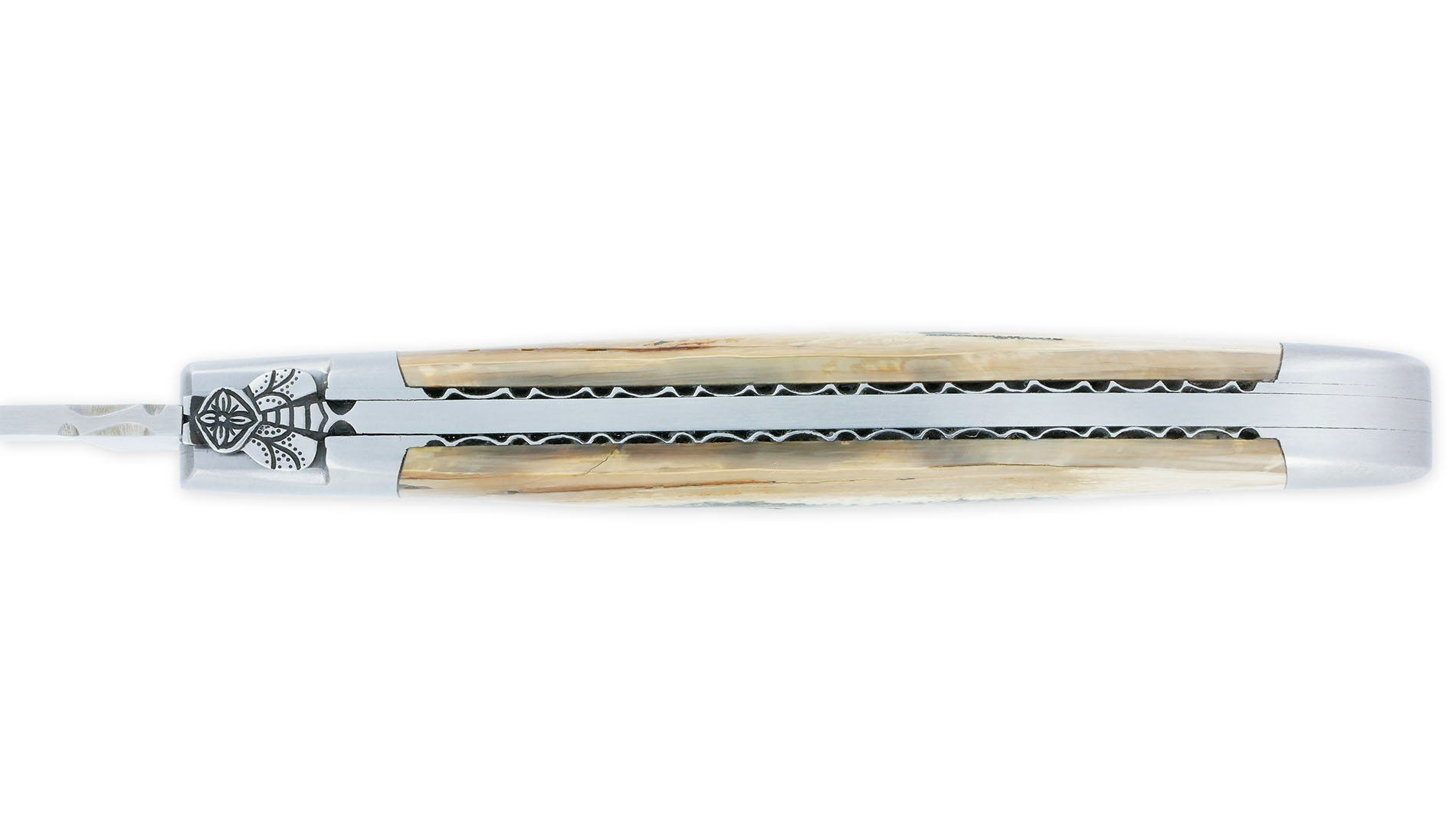 Le manche est sculpté dans un ivoire de mammouth naturel, dévoilant de subtils reflets gris bleuté, particulièrement recherchés.
