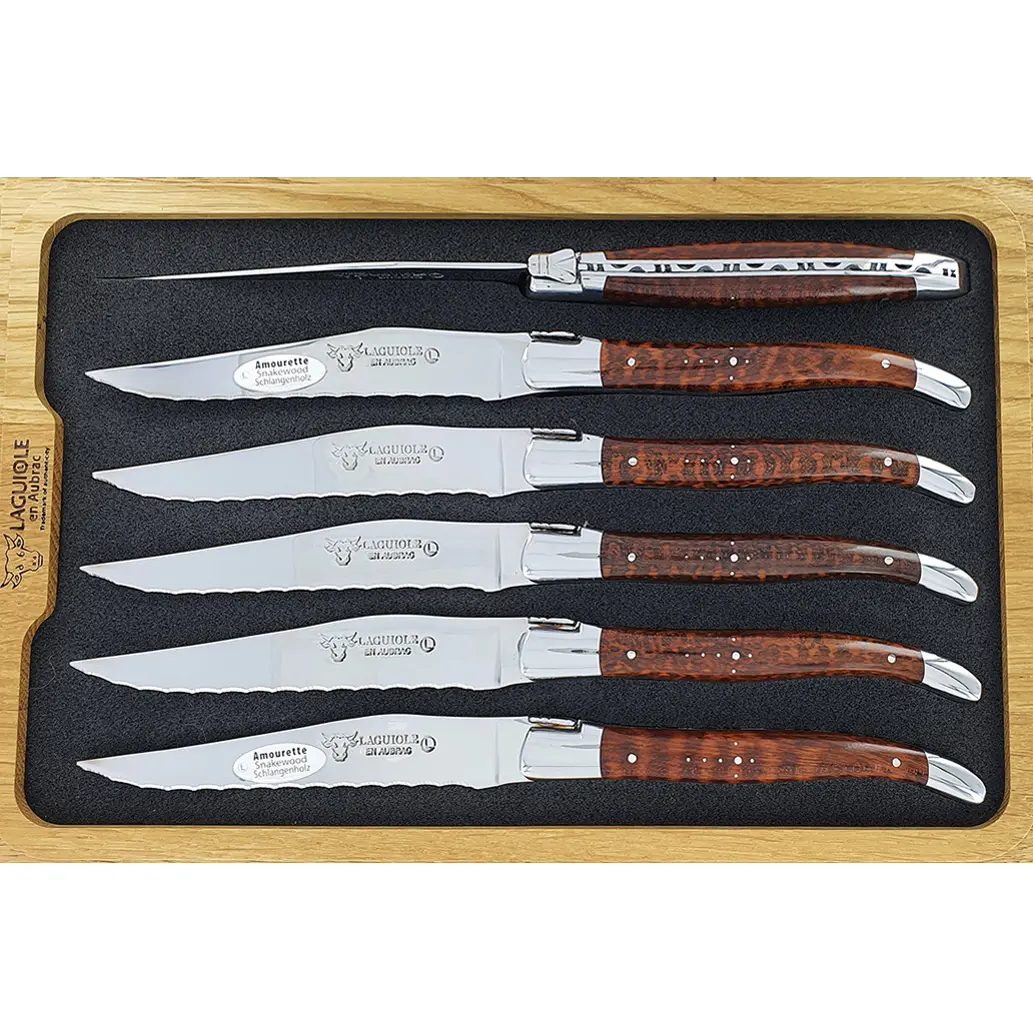 Coffret de 6 couteaux de table Laguiole en Aubrac – Bois d’Amourette & Lame dentée inox brillant